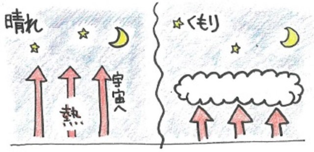 北陸の冬は雪が多く、晴れたら嬉しくなりますよね。でも、夜に晴れていると熱が宇宙へ逃げていきます。この現象を「放射冷却」といいます。くもがあると地球が服を着ていることになるので、熱が逃げにくいため、気温が下がりにくくなります。