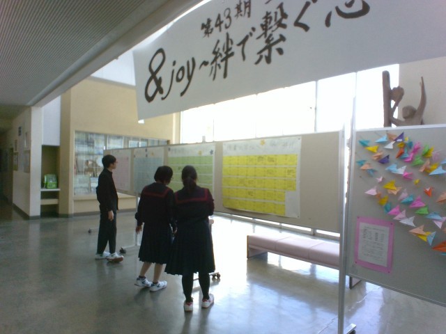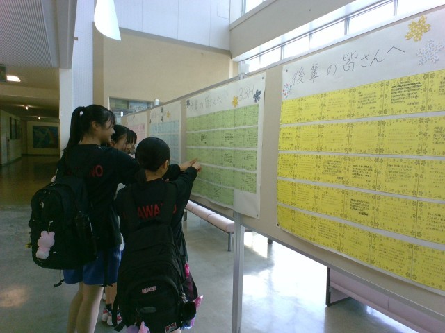 3年生から後輩へのメッセージを生徒玄関ホールに掲示しました。1・2年生から3年生に向けた応援メッセージの紙飛行機の横に並んでいます。部活動や実践部、地域の後輩に向けた感謝や後輩に残したい言葉を書きました。1・2年生の皆さん、ぜひ読んでください。