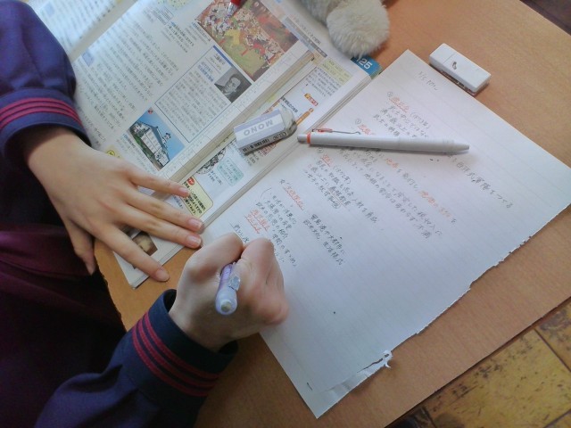 社会の授業では、明治時代の歴史について学習しています。大切なポイントをよく聞いて、ノートを丁寧に書いています。