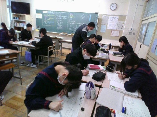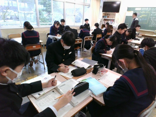 理科の授業では、フレミングの左手の法則を学習し、問題を解いていました。少し難しい問題にも諦めずに向き合い、班員と一緒に頑張っていました。