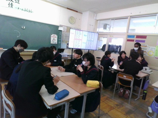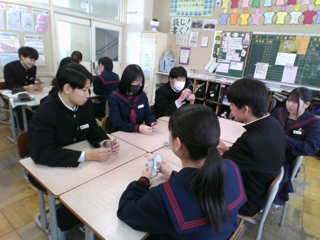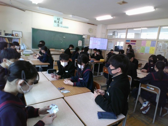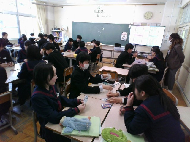 今日の英語の授業は、受け身の文のカードを使ってALTの先生とカードゲームをしました。ALTの先生が作ってくださった洋楽のクイズもしました。聞き慣れた曲も多く、楽しんで活動していました。