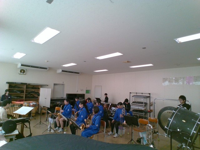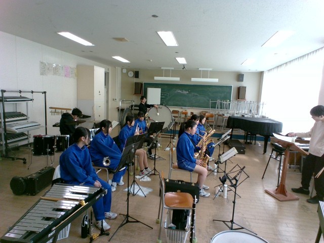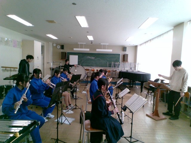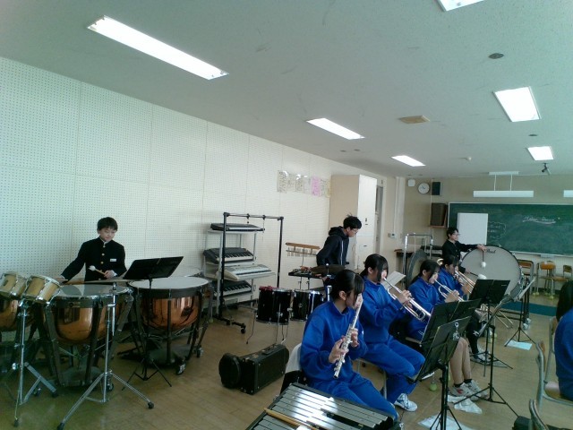 吹奏楽部は来年度のコンクール演奏曲「マカーム・ダンス〜ウインド・アンサンブルのために〜」の練習に励んでいます。今日は、1・2年全員揃って、各楽器やパートの音を確かめています。部員はわからない箇所を質問し、足りない楽器を足していきながら進めています。4月には新1年生を迎え、完成させていく予定です。