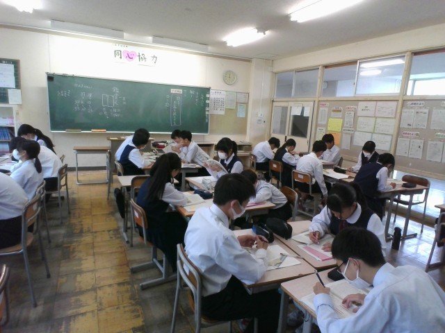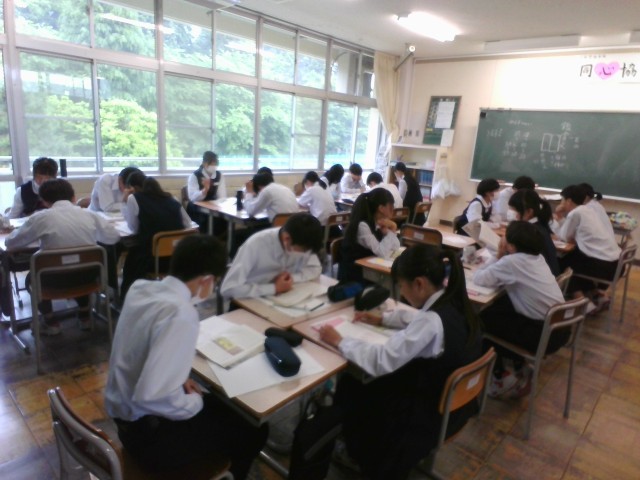 21Hの国語の授業です。今日は、「クマゼミ増加の原因を探る」という説明的文章を音読しました。やや難解な語句が多いので、時間がかかりましたが、互いに教え合って読み進めました。