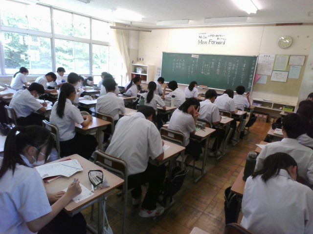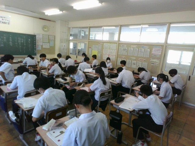 2年、国語の学習では、既習の内容を復習しています。説明的文章や短歌について問題を解きました。期末考査も近いので、とても真剣です。