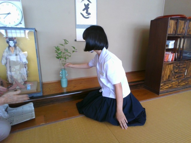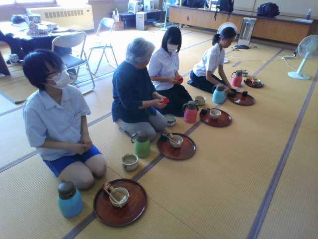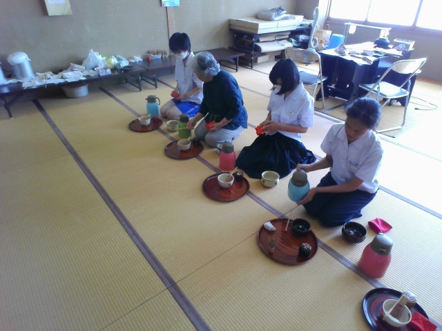 お茶のお稽古です。礼法室、誠に気温が上がっております。本日、お華は、ムクゲ、お菓子は松露でございます。