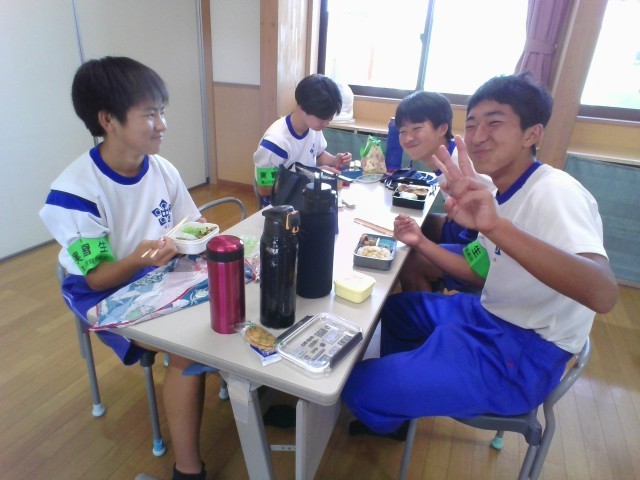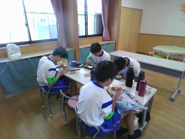 「社会に学ぶ『14歳の挑戦』」1日目です。児童館では、庭の草取りや庭清掃を行いました。午後の活動に備えて、仲良くお弁当タイムです。