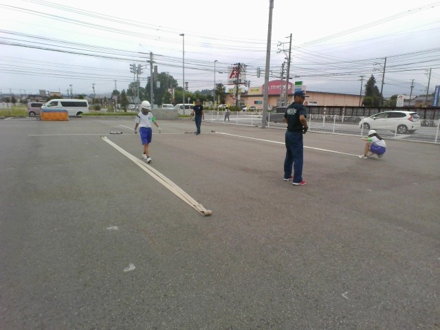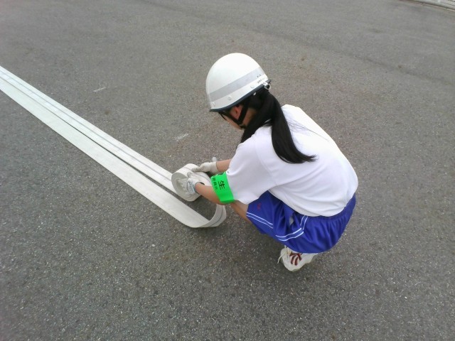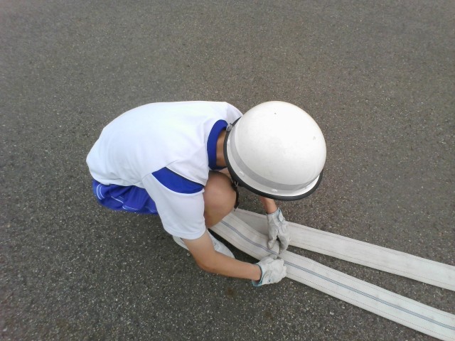 「社会に学ぶ『14歳の挑戦』」2日目です。消防署では、ホースの取扱の訓練です。ホースは、見た目以上に重く、迅速に行動するのは難しそうです。
