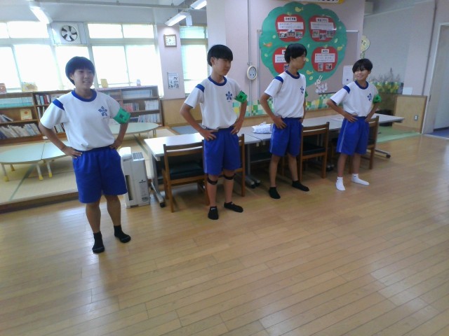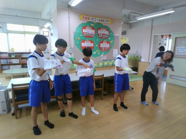 「社会に学ぶ『14歳の挑戦』」3日目です。児童館では、幼児と保護者様のお世話をしました。大きな絵本の読み聞かせや、七夕飾りの補助等、大活躍です。