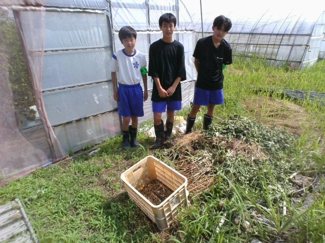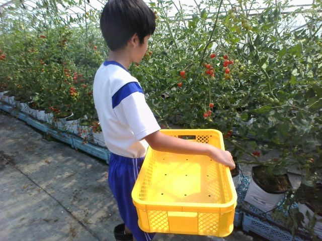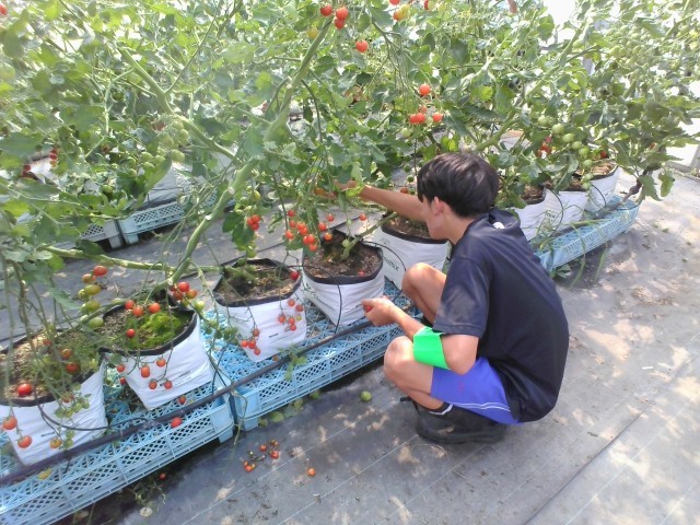 「社会に学ぶ『14歳の挑戦』」3日目です。農業施設では、長靴で、ビニルハウスのミニトマトの収穫、荷物運び等、暑さの中で頑張っています。