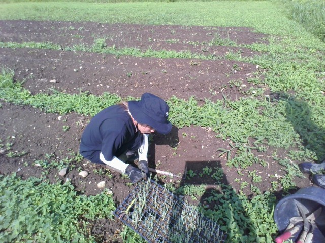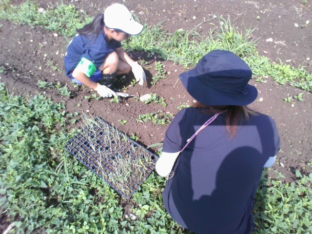 「社会に学ぶ『14歳の挑戦』」3日目です。農業施設では、畑で、草取り、ネギの苗植えです。朝から気温がぐんぐん上がっています。前日に雨が降って、土が柔らかいです。