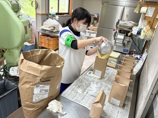 農業施設で、収穫された麦と米粉でケーキの原料を作ったり、生まれたてのひよこの世話をしたりしました。