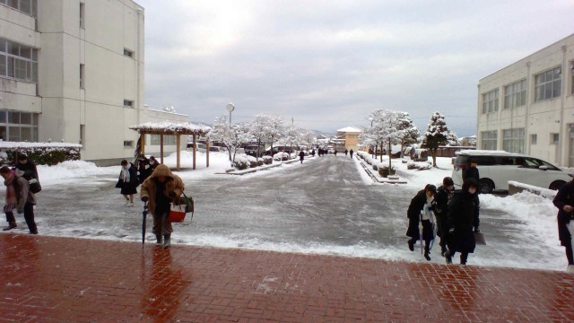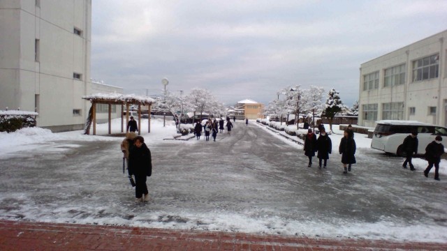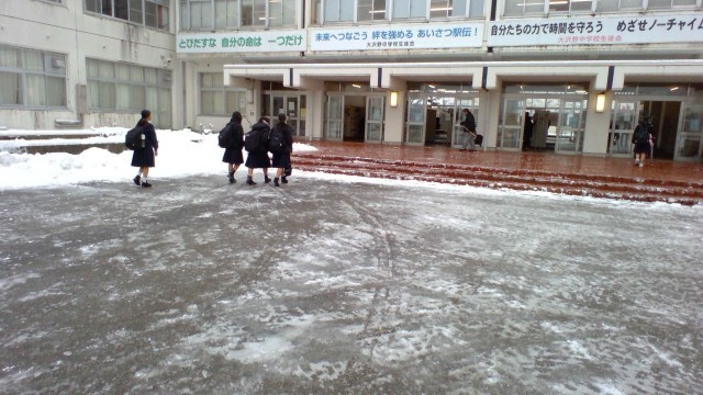今日は寒くて路面が凍結しています。しかし、生徒の皆さんは寒さに負けず元気に挨拶しています。今朝は22Hの生徒の皆さんが、玄関アプローチの除雪をしてくれました。
