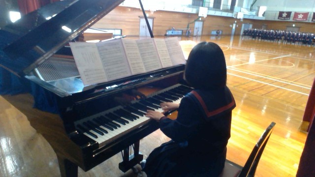 1・2年生による卒業式の歌練習の様子です。指揮、伴奏、合唱、アドバイスは、全て生徒たちが行います。体育館に美しい音色が響いています。
