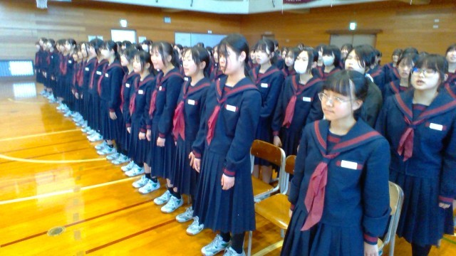 1・2年生による所作の練習です。体育館で、卒業式に向けて、在校生1・2年生が動作の確認を行いました。「起立」「着席」「礼」「姿勢の保持」等、式典にふさわしい動作を確認できました。