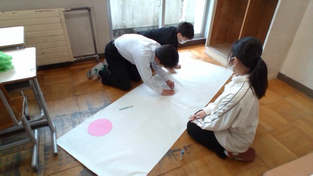 卒業式当日に3年生教室に飾る掲示物を作成しています。各クラスの有志が集まり、やる気満々です。当日、立派な卒業式になるように工夫を凝らしています。
