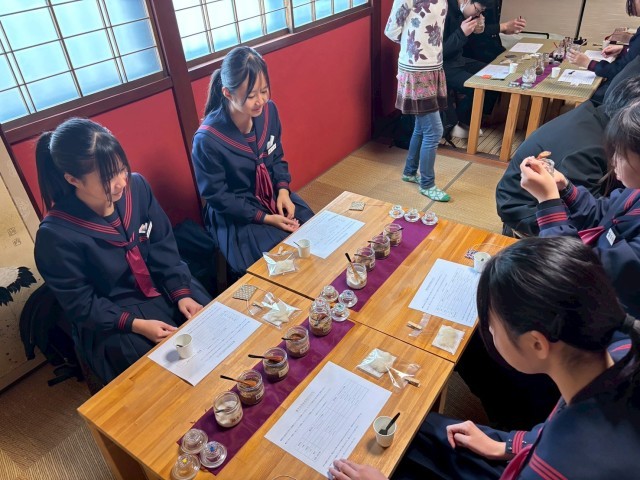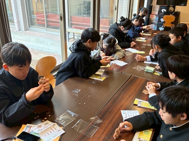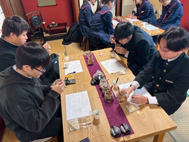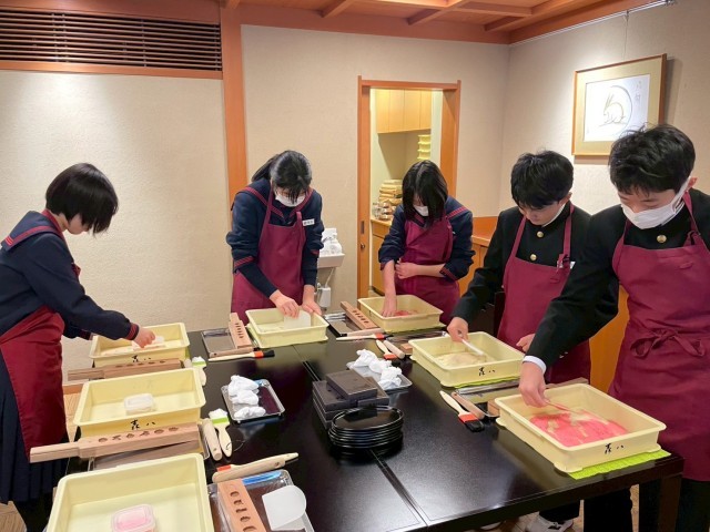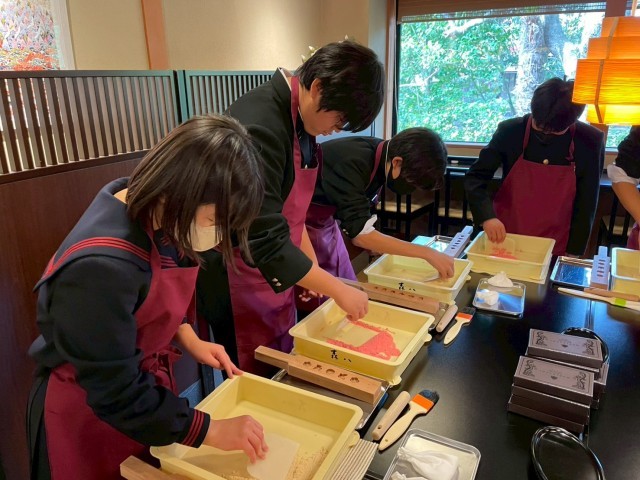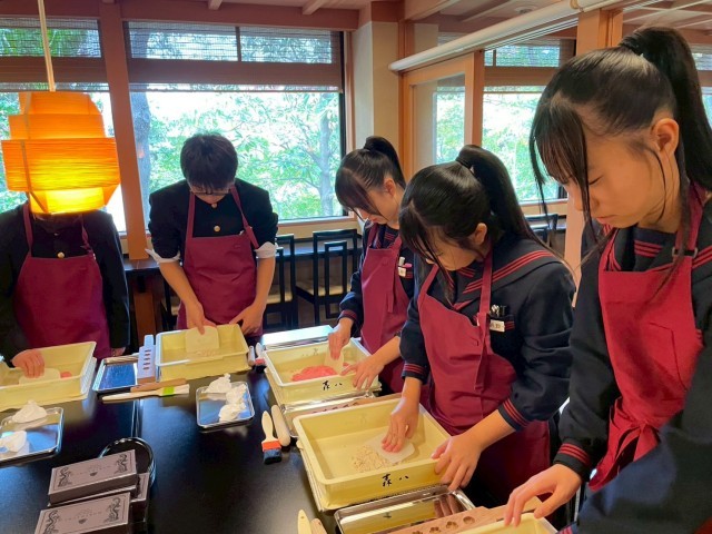 和菓子作りでは、説明を聞きながら真剣に取り組んでいます。