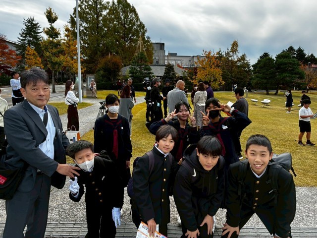 21世紀美術館の前で記念撮影。後ろではテレビのロケが行われていました。