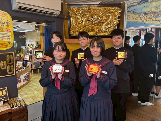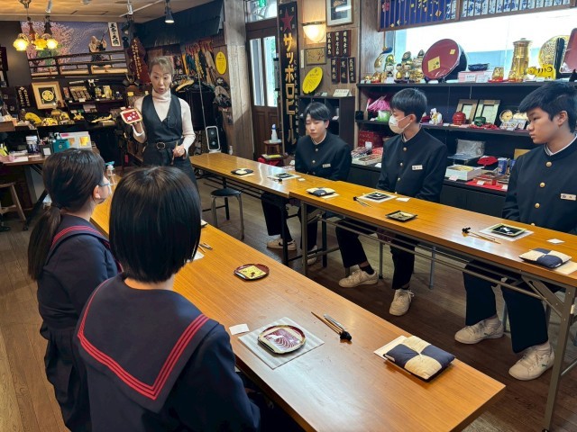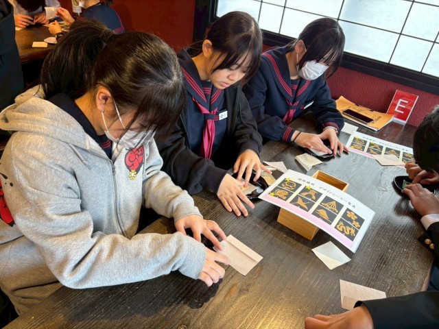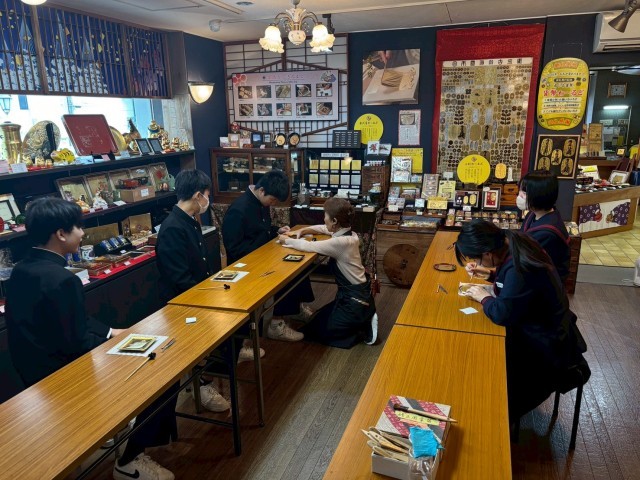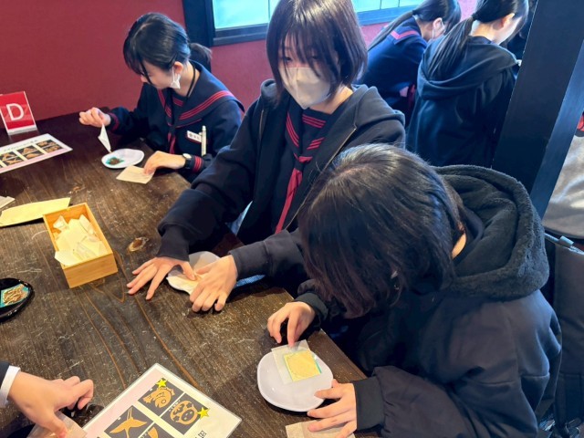 金箔貼り体験では、デザインを自分達で選び、思い思いの皿を作成しました。