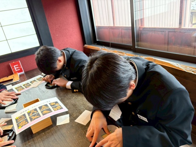金箔貼り体験では、丁寧にデザインシールを貼りながら製作しています。