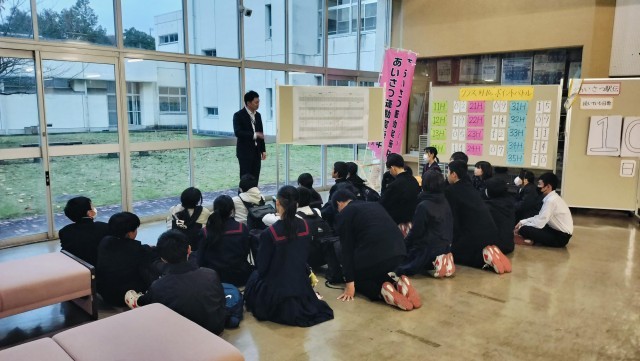 2学年は、明日の「金沢校外学習」に向けて集会です。代表が、校長先生に決意表明をしました。
