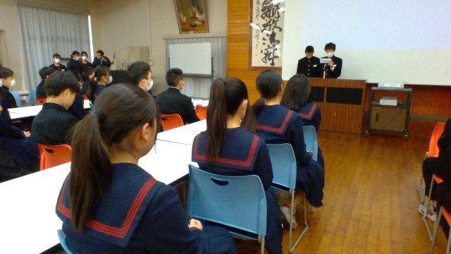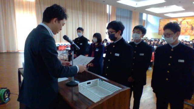 2学年、学年集会の様子です。学年のリーダーの生徒から「金沢校外学習写真コンテスト」の表彰がありました。