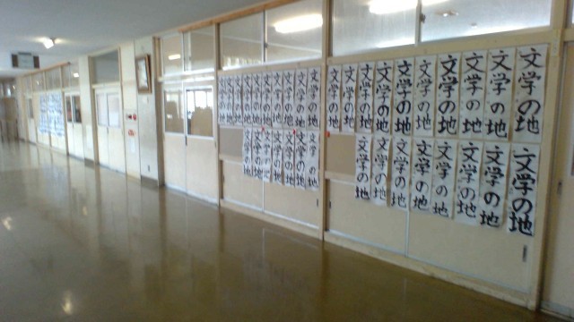 2学年、国語は書道の時間です。書初めの練習をしています。行書で「文学の地」と揮毫しています。