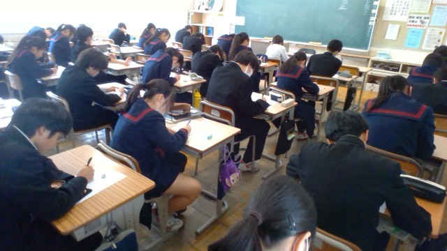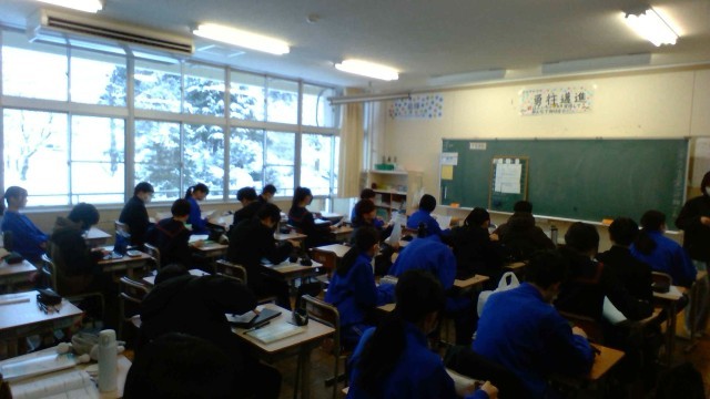 2学年は、実力確認テストを実施しています。本日は、私立高等学校の一般入試の日です。1年後をイメージして、5教科のテストを受けています。