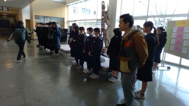 雪のちらつく朝です。玄関ホールでは24H生徒の皆さんが、「おはようございます。」と元気な挨拶で、みんなを迎えました。