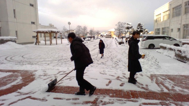 富山の冬らしい朝です。23Hの生徒さんが除雪をしてくれました。路面は凍結しています。