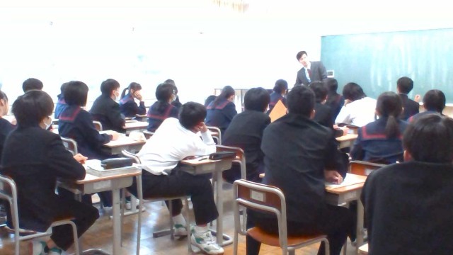 2学年集会の後半の様子です。先生から、「テキスト」を真面目に行っている生徒の学力が向上していると説明されました。また、春休みの健康安全について、自分の進路についてしっかり考えておくようにという説明もされました。