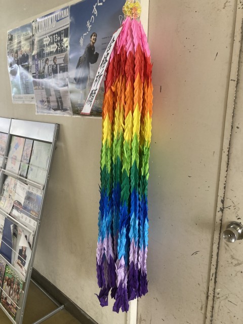 昨年度、進路の実現を願って3学年全員で折った鶴を3学年スタッフで、糸を通して「千羽鶴」にしました。