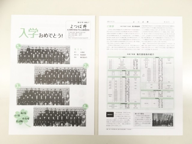 本日、大沢野中学校PTA広報誌「よつば野」第119号を全校生徒へ配布しました。ご家庭でぜひご覧ください。