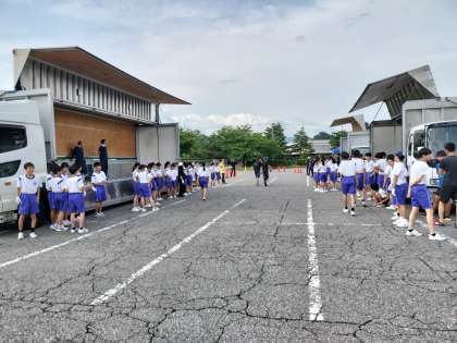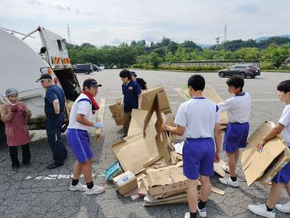 水緑公園駐車場で、朝8時から10時まで資源回収が行われました。連日猛暑が続く中、1年生22名、2年生21名、3年生30名の合計73名もの生徒が参加しました。
