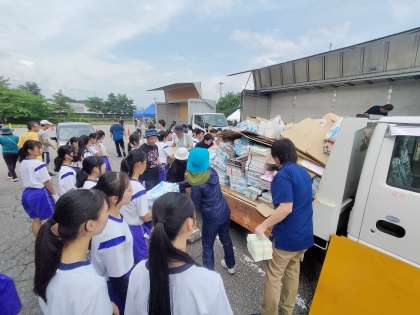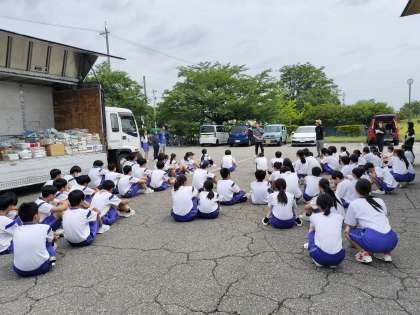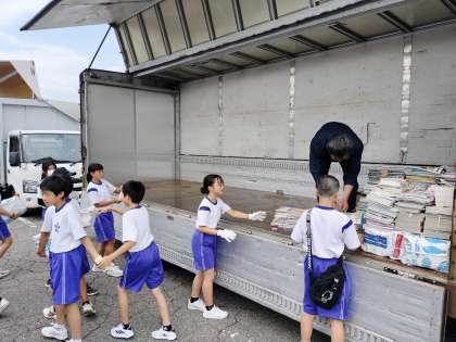 車やトラックが到着するたびに、新聞や古雑誌、古着、制服のリユース品が生徒によって運び出され、たくさん回収することができました。参加した生徒の皆さん、お疲れ様でした。