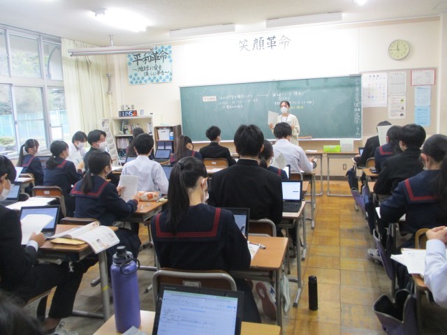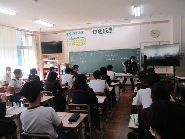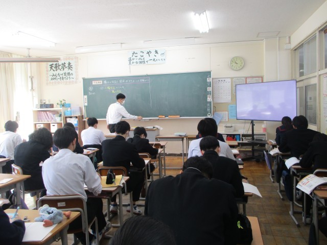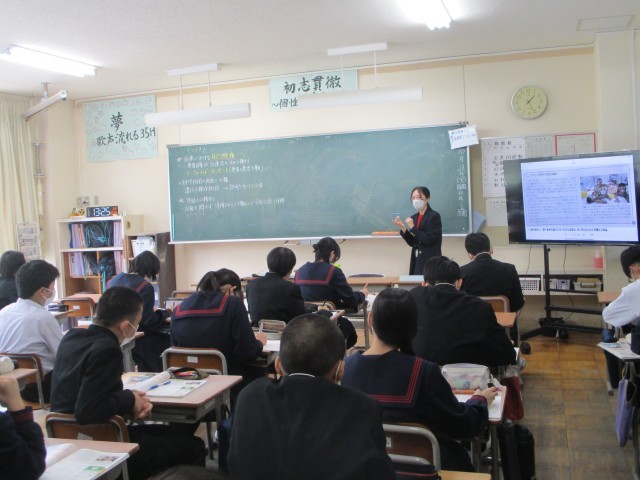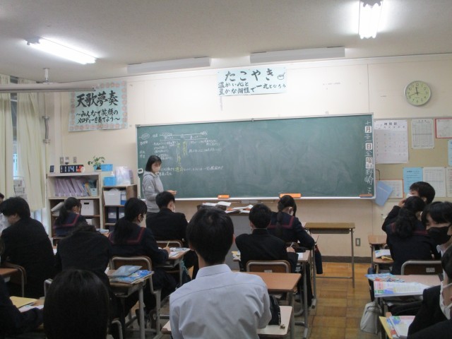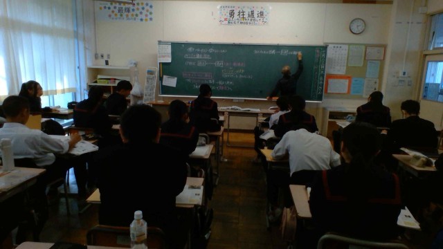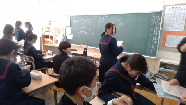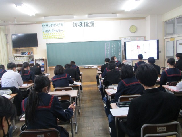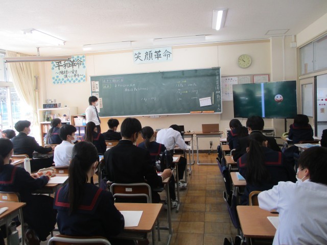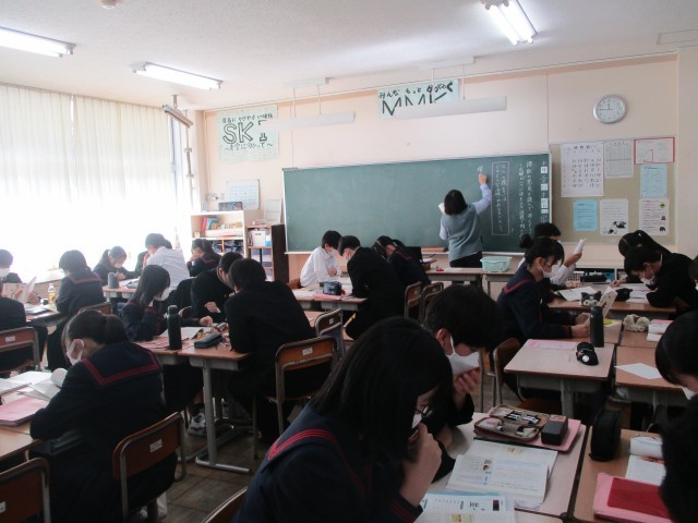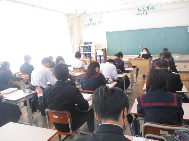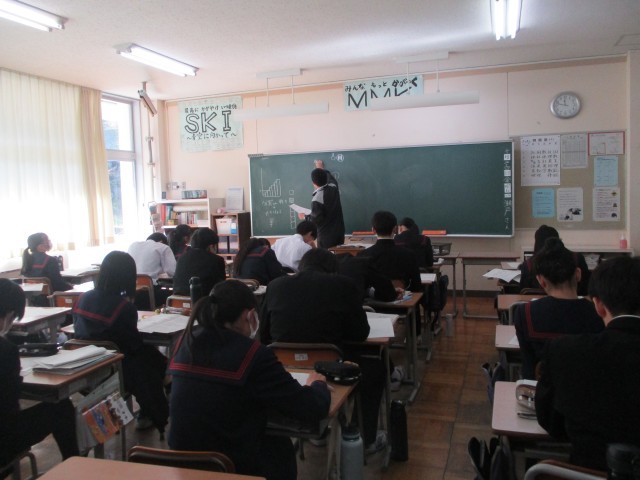 6限目、2学年社会科です。「イギリスの議会政治」の学習です。楽しく和やかに学習が進行しています。「ピューリタン革命」、「名誉革命」等、生徒たちは、積極的に発言しています。先生の黒板の文字が大変わかりやすいです。大切な箇所は、先生が丁寧に説明なさっています。
