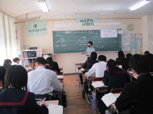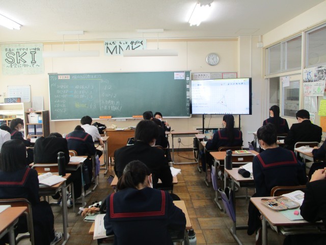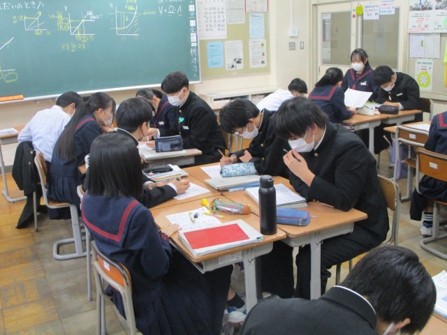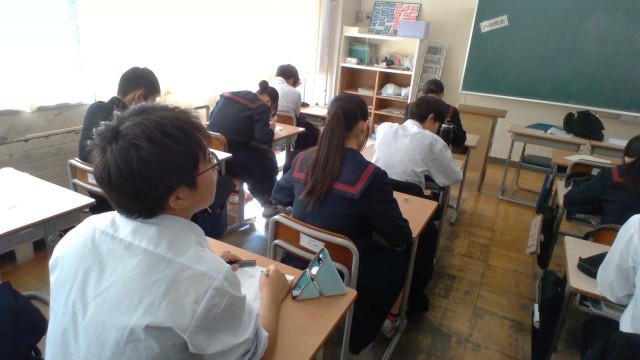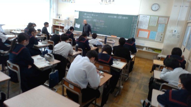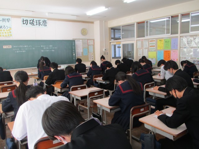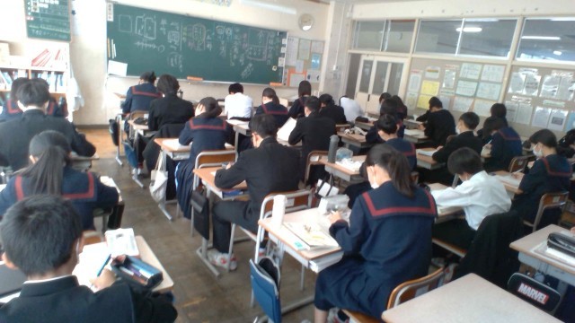 2学年、6限目数学の授業の様子です。一次関数のグラフ、方程式の小テストが行われています。集中して問題を解いています。