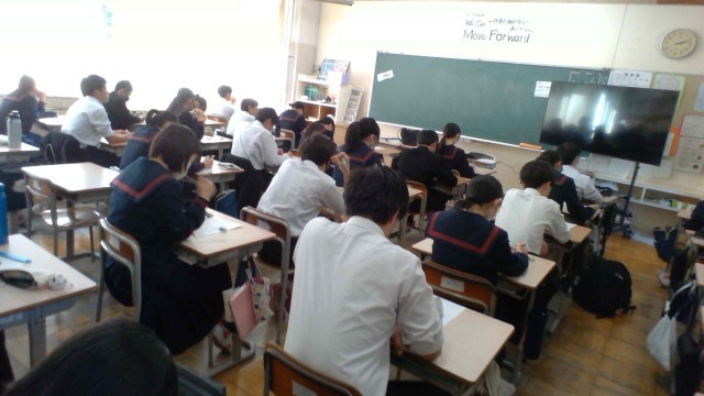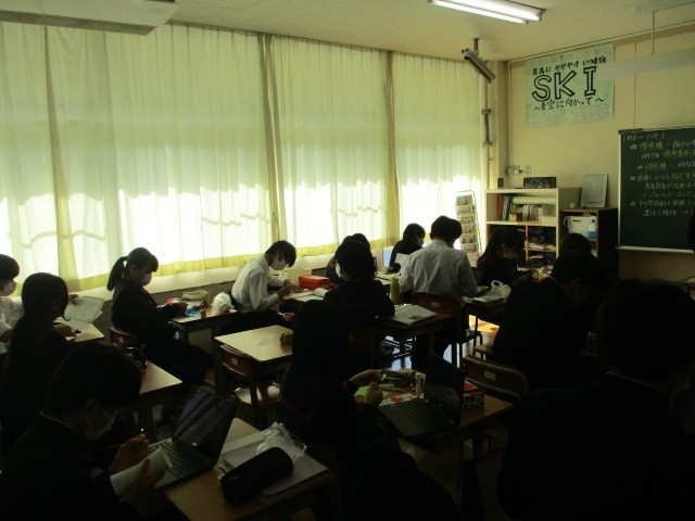 2学年英語の学習活動です。英語の曲を集中して聴き、歌詞をメモしたり記号で答えたりしています。集中力が求められます。
