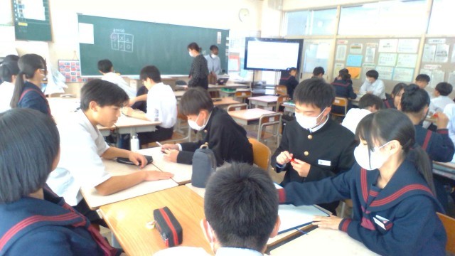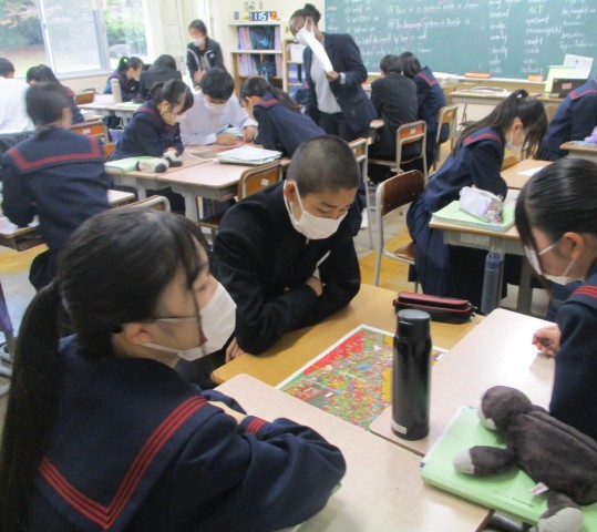 6時間目、2学年英語科のリスニング学習です。英語の曲が流れます。「聞き取って歌詞の空欄のシラブルは、何でしょう。」集中して聴き、グループで相談です。