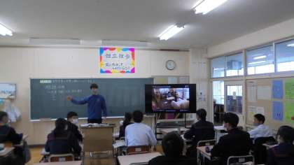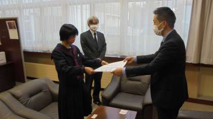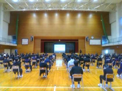 生徒を代表して、生徒会長が寄贈式に参加し、「ICT機器を使う授業が多い中で、大型モニターは見やすく、分かりやすいものです。大切に使っていきたいと思います。」とお礼を述べました。 -