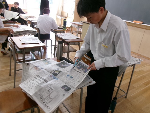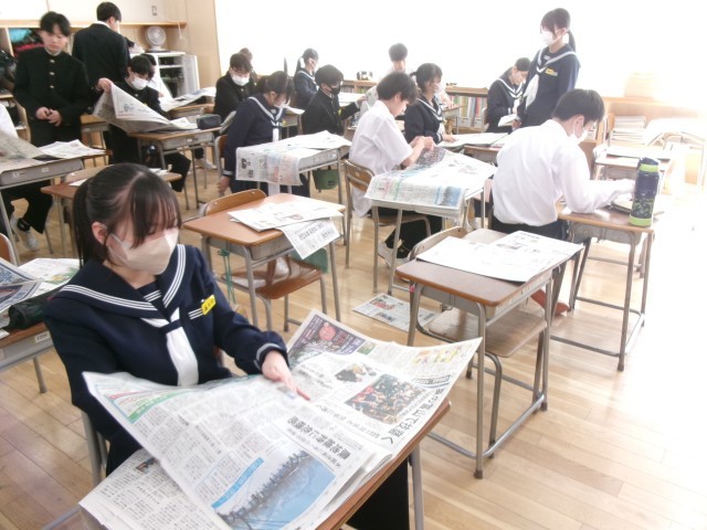 2月12日(木)「授業のようす」 公開日 2026/02/12 更新日 2026/02/12 学校生活 ・1-2は今週、NIE授業の取組として毎日1つずつ新聞記事のスクラップをしています。・2年家庭科で製作したエコバッグ(リバーシブル:防災袋)を展示しました。・3ー2は美術の授業でペーパーウェイトづくりをしています。・3-1の体育では、バレーボールとフットサルに分かれて活動しています。 +5