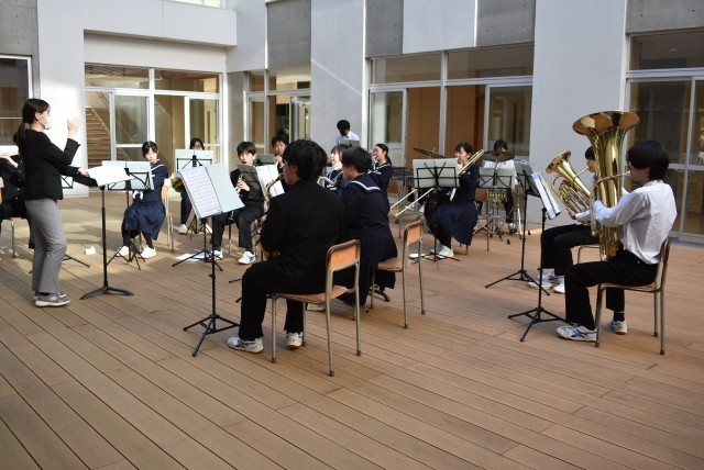 4月21日(火)吹奏楽部 「演奏」 公開日 2026/04/22 更新日 2026/04/21 部活動 吹奏楽部は、部活動への入部を考えている新入生に向けて、創作テラスで演奏を行いました。 学年を問わず、たくさんの生徒が演奏に聞きに来てくれました。
