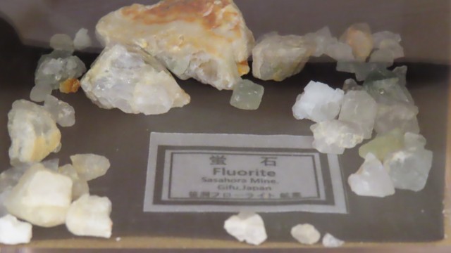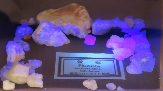 4月28日(火)「理科室前に」 公開日 2026/04/28 更新日 2026/04/28 校長室から 岐阜県に「蛍石(ほたるいし)」が採れる廃鉱跡があります。※要予約蛍石は、ブラックライトで照らすと独特の光(蛍光)を示す面白い鉱物です。去年の夏にそこで採ってきたものが理科室前に展示してあります。(写真上)普通に撮った写真。(写真下)上からブラックライトを当てたところ。青く光って見えるのが蛍石。蛍石ではない奥の大きな石はブラックライトに反応していない。