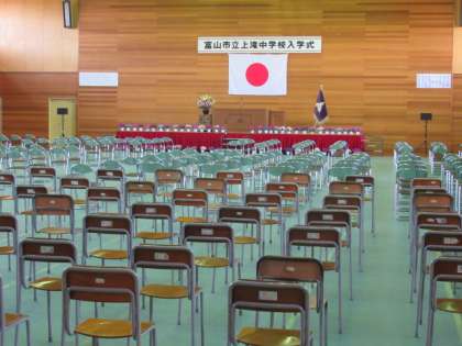 会場は在校生が準備しました。あとは、明日、新入生を迎えるだけです。