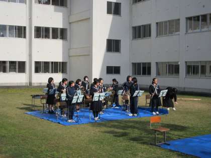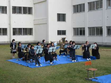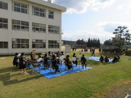 4月9日(金)「吹奏楽部 演奏会」 公開日 2021/04/10 更新日 2021/04/10 部活動 放課後、吹奏楽部が1年生の勧誘を兼ねて演奏会を行いました。 美しい音色が校庭に響きわたり、部活動の練習を一時止めて聴いていました。