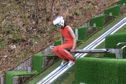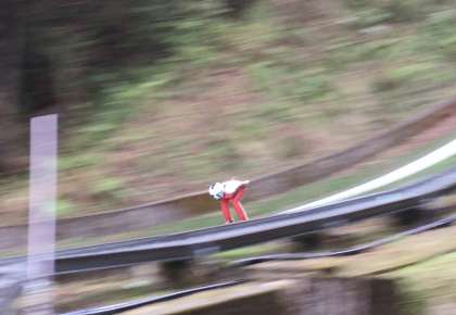 ジャンプは飛距離と美しさ(飛型)を競う競技です。遠くに飛ぶためには、力強く踏み切ることが大切ですが、実はその前の助走やスタートのフォームが重要です。今日はスタート時の脛の角度と足裏の体重のかかり方を意識して練習しました。少し良くなりました。