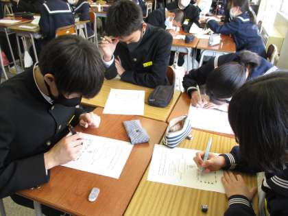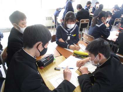 2組の学活は、「リフレーミング」のワークシートのグループ学習をしています。人を独自の視点で見るのではなく、見方を変えて違う受け止め方や感じ方を他の友達から学びます。