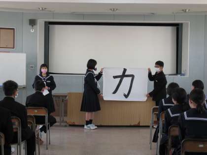 事前にとったアンケートで全員の考えを受け止め、まとめた結果、2学年前期の学年目標は、「力」に決定しました。具体的にどんな力を付けて欲しいのかを示さず、「力」と示すことで、個人でどんな力を付けたいのかを考えて行動することができます。学力、体力、行動力、対応力、創造力など、これからどんな力を身に付けたいかは人それぞれですので、しっかりと自分の中で「どんな力をつけたいか」を考えて行動しましょう。