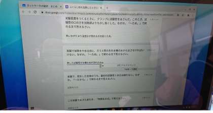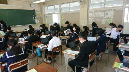 クロムブックを利用し、復習問題に取り組んでいます。自分で教科書や資料集から必要なことを探し出し、クラウド上の復習アプリにそれぞれの答えを打ち込んでいっています。記述問題だけでなく、選択問題もあるのでみんな楽しそうに答えていました。