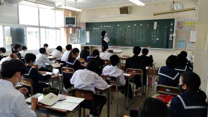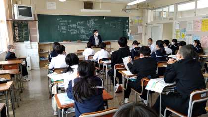 1組は理科で生き物の種類について勉強していました。生徒からは「カメレオンは何の種類ですか?」「カタツムリやナメクジは?」など、先生にたくさん質問していました。