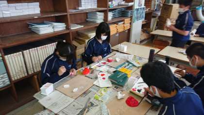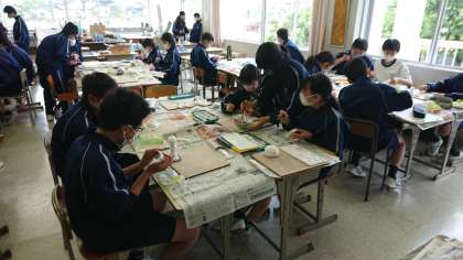 生徒がリンゴをテーマに紙粘土を使って、思い思いのデザインで造形をしています。リンゴそのままのものがあったり、人物にしてみたり、とても楽しく授業に取り組んでいました。
